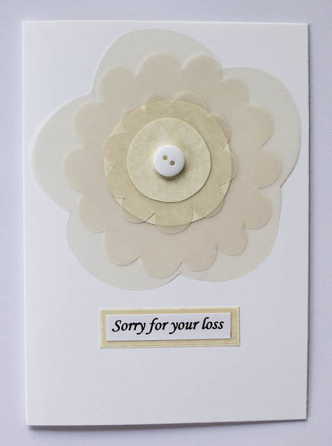 Sorry for Your Loss Flower Card £1.50 Published August 10, 2013 at 476 × 640 in Wedding stationery Sorry for Your Loss Card A6 white card with handmade cream vellum flower. White Button centre. Card left blank for own message. THIS CARD IS SOLD, BUT SIMILAR ONES CAN BE MADE TO ORDER.